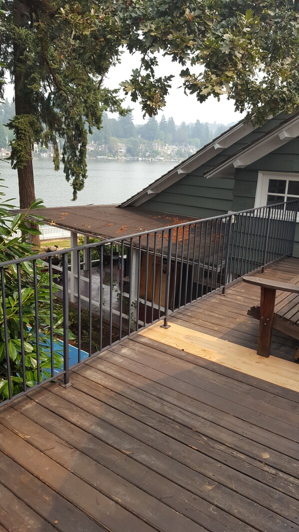 Sit on the private deck with your coffee or wine and take in the view or wander down to the lake for a swim or paddle board. Located on the main section of Lake Oswego with a low bank makes it easy to enjoy the water. This cozy studio has knotty pine walls and heated floors with Mexican pavers and an air conditioner for those warm nights. The kitchenette is well stock and the bed is Queensized .