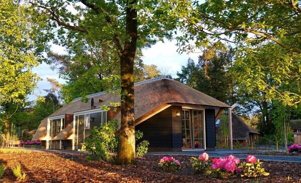 The name “Zonnehoed” refers to the beautiful thatched roof that extends over both the house and the covered terrace. It also refers to the yellow (rudbeckia) and purple (echinacea) flowers that bloom in the garden.