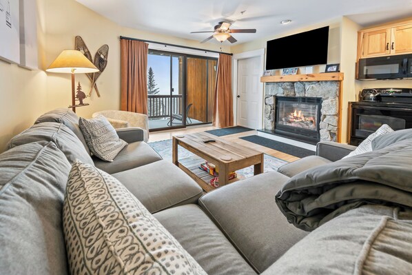 Inside, the condo is thoughtfully equipped for a comfortable stay. You'll find a fully equipped kitchen with a dishwasher, a cozy living area with a propane fireplace, Smart TV, and WiFi, plus a washer and dryer for added convenience. The unit is also pet friendly (dogs under 30lbs), and includes a ski locker for easy gear storage. In warmer months, enjoy the grill (available mid-May through mid-October).