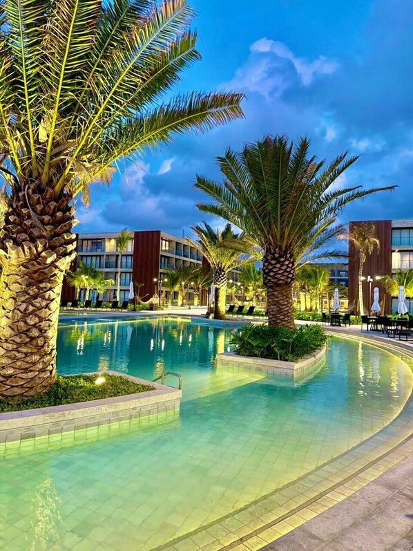 Yes, this property has 6 outdoor pools and a children's pool.