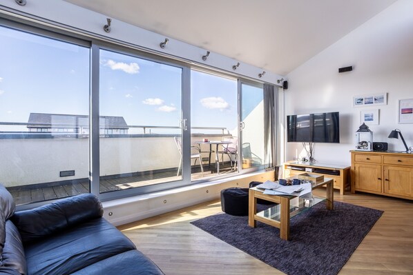 Up top, the second floor is the showpiece, a light-filled, open-plan living, dining, and kitchen space that's perfect for gathering. Modern sofas and armchairs, wood floors, and a dining table for eight create a welcoming space to relax, dine, and enjoy time together. The bespoke, well-equipped kitchen has everything you need to whip up meals, and the lounge offers WiFi, Sky TV for cosy evenings. Step out onto the balcony from the dining area and soak up panoramic views across the sea, mainland, and Snowdonia.