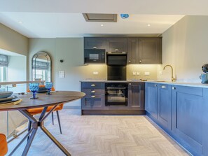 Tucked away in a quiet mews, Frenchgate Mews is a 17th-century Grade II-listed cottage with luxurious touches and quirky style. Upside down by design, the open plan living space on the first floor takes full advantage of views across Richmond's quaint rooftops to the castle. With Smart TV, soundbar, and electric fire in the living area as well as an en-suite bedroom with kingsize bed downstairs.