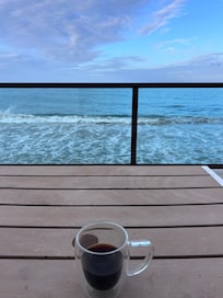 Escape to Suite 204 at Corcega Beachfront Suites, where luxurious decor and plush bedding create a haven for relaxation. Enjoy the serene beach view from your private balcony on the second level floor, unwind in the quaint kitchenette or indulge in a rejuvenating experience with solar-powered amenities.