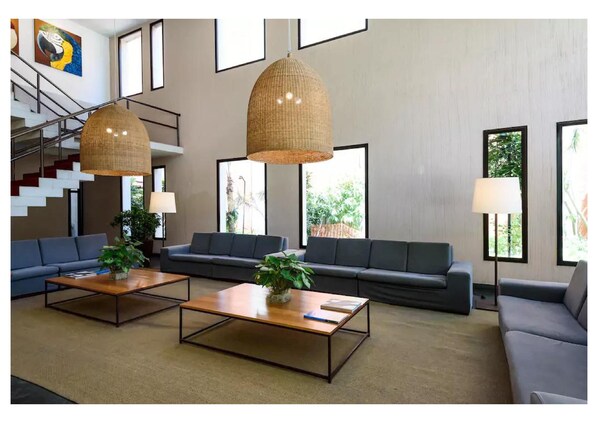 Travelers experience Copacabana's lively atmosphere at Real Residence HOTEL. The aparthotel features a heated pool surrounded by gardens, a gym, WiFi throughout the rooms, and an on-site restaurant. Accommodations comfortably house families or groups of up to 5 people.