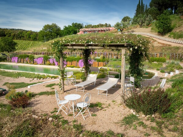 Outside, your private space features a garden, barbecue, and outdoor shower. You can also enjoy a large shared garden with a gazebo, outdoor shower, and a beautiful natural pool (biolake) 20 meters long, set in an ecosystem rich in seasonal blooms, overlooking vineyards and the sea: a perfect place to relax in nature.