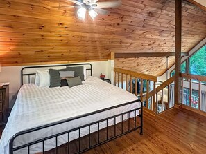 Buckhorn cabin offers a secluded mountain retreat with western/cowboy-themed decor and plenty of lake-inspired touches. Enjoy the stone gas-log fireplace, hot tub under the stars, or roast marshmallows over the outdoor fire pit after exploring nearby attractions like Biltmore and Smoky Mountain Railroad.