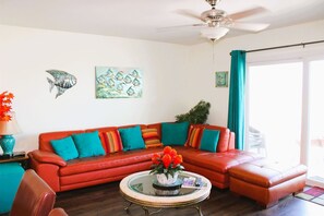 Bayfront Condos at Kontiki, nestled on the bay’s edge, offers a serene retreat for up to six guests. Unwind in the spacious living room with picture windows and doors leading to a private deck overlooking the pier that extends into the bay.
