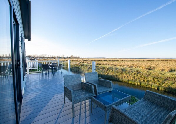 Located near 7 miles of sand and sea, this luxury lodge offers a relaxing retreat with modern amenities. Unwind on the large wrap-around deck overlooking the river, fields, and wildlife. Enjoy family time in the spacious living room or take advantage of nearby facilities like swimming pools, go-karts, mini golf, soft play areas and evening entertainment for all ages.