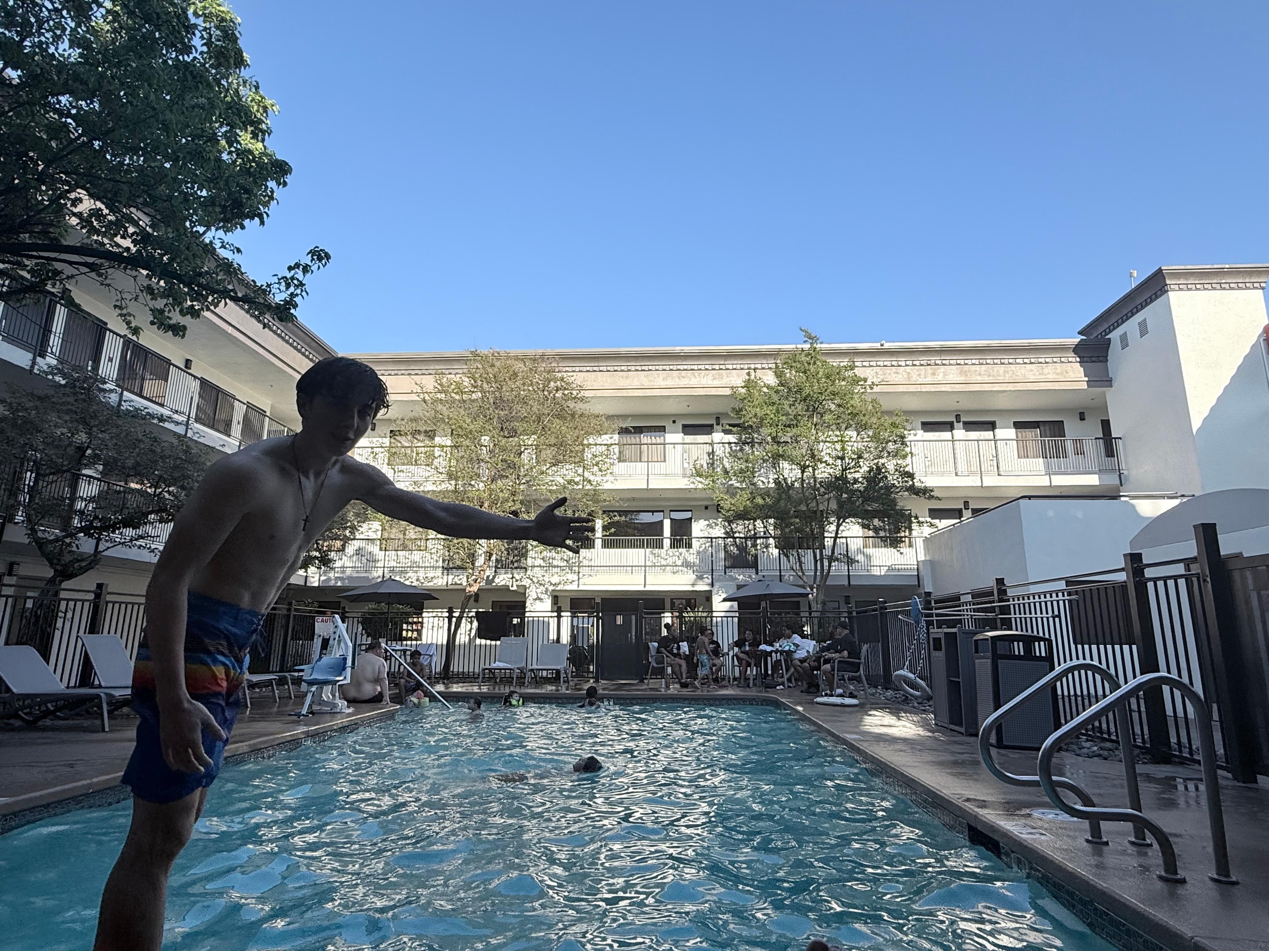 Yes, this property has an outdoor pool. Pool access is from 8:00 AM to 10:00 PM.