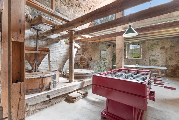 Inside the house, on the lower floor you will find the games room, where the ping-pong table and the table soccer coexist with the old machinery of the old mill.