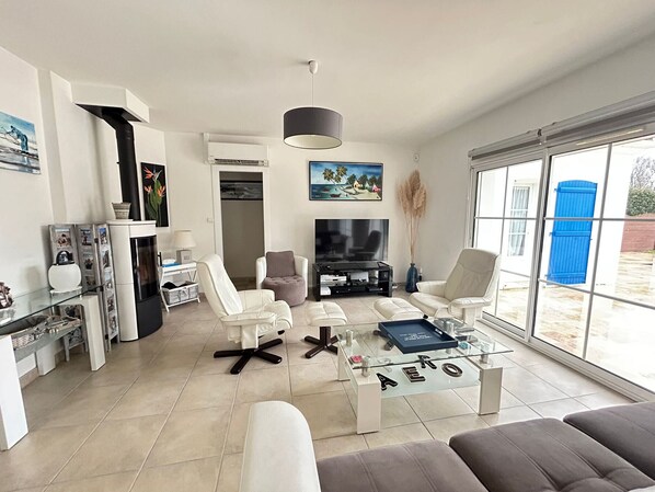 - ENTRANCE: furniture - wardrobe -- - LIVING ROOM: access to large terrace and swimming pool - table - chairs - flat-screen orange TV - sofa - armchairs - furniture - coffee table -- - FULLY EQUIPPED KITCHEN: sink - American-style fridge/freezer - 4 induction hobs - oven - microwave - dishwasher - cupboards - table - chairs - filter coffee maker -- BEDROOM 1 (master suite): access to terrace - 1 double bed (160cm) - bedside tables + lamps - flat-screen TV - chest of drawers - wardrobe -- BATHROOM: double vanity unit - walk-in shower -- - BEDROOM 2: 1 double bed (160cm) - bedside tables + lamps - wardrobe -- BEDROOM 3: 1 double bed (160cm) - bedside tables + lamps - wardrobe -- BATHROOM: double vanity unit - corner bath - toilet -- - WC Separate -- - CELLAR: washing machine/dryer -- - CARPORT -- - garden furniture - outdoor lounge - deckchairs - parasols - charcoal barbecue -- - NO PETS ALLOWED