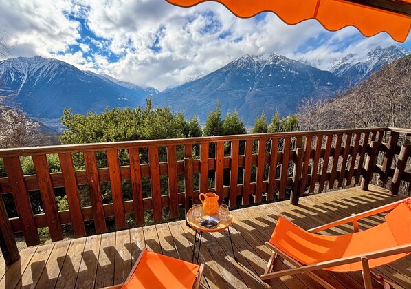 A detached, independent chalet in a quiet setting, offering open panoramic views over the Maurienne Valley and the Alpine range, facing the Belledonne massif.