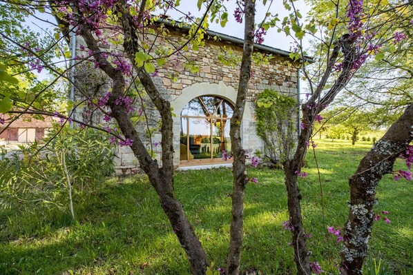 This bright house, facing east and west, includes a private terrace and a rustic 1300 m² orchard with seasonal fruits (apples, pears). Enjoy a fenced 4x8 m pool, open from May to September, with set swimming hours. A tennis court is shared with the owners. A small unfenced pond is 200 m from the house; children should be supervised.