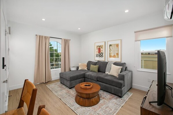 As soon as you arrive, you'll immediately notice the warm and authentic Spanish accents offering a delightful ambiance throughout the space. The living area is tastefully furnished for unwinding after a day of exploring the city. Relax and enjoy your favorite shows on the flat-screen, smart TV.