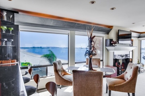 Perfect for a romantic getaway, Karla’s South Corner Condo is a 1BR/1BA retreat with one of the best views on the east side of Sail Bay. Floor-to-ceiling windows and a private balcony offer 180° views of Mission Bay, sunsets, and bay activities—kite-boarders, sailboats, water skiers, and more. The open living area features a gas fireplace, flat-screen TV, and sleeper sofa for additional guests.