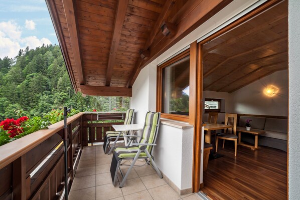 Outside, you will find a shared garden and balcony, plus a covered terrace with mountain views. The nearest supermarket is just a 5-minute walk away (400 m). In St. Leonhard in Passeier, you will find bakeries, restaurants, and bars, as well as an outdoor adventure pool with free entry, open from mid-May to early September. The nearest ski area (Jaufen/Ratschings) is only a 15-minute drive away (17 km). Innsbruck Airport is about 2 hours away by car.