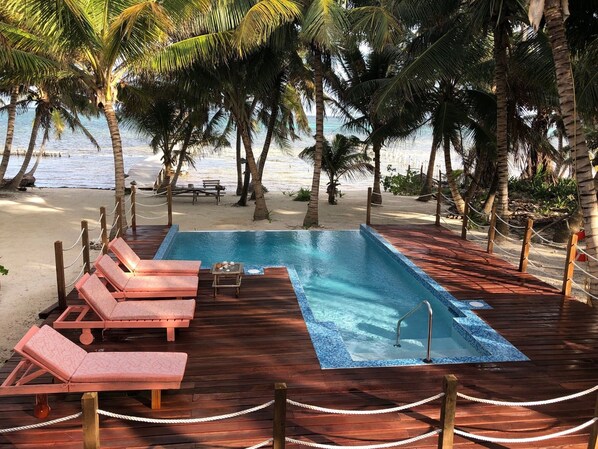 SITUATED RIGHT ON THE BEACH with a sparkling new 450 square foot infinity swimming pool, sun deck with new lounge chairs, private beach, private resort size pier featuring a huge gazebo at the end called "Palapa" in Belize. Its perfect for star gazing at night with your sweetie. Large beautifully landscaped private fenced yard, large private house right on the beach, tropical coconut trees, beautiful flowers, garden and endless white sand beach. We remove seaweed from our beach every day to ensure that you have a beautiful beach with no foul odors.