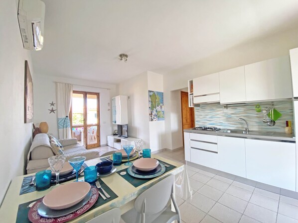 The flat open on three sides, is the last of the row, in a ventilated and reserved, enjoys views of the countryside and the surrounding hills, consists of a 'large living room with kitchenette, with double sofa bed, a double bedroom, bathroom, utility room with washing machine and bike 2 covered porches on two sides of the property, these are equipped with table and chairs, one overlooking the private garden with barbecue, an additional outdoor shower, has a separate entrance car parking to the private garden. The apartment also has TV with decoder, iron, vacuum cleaner, toaster, cot, children's toys, games, cards, assorted library etc .. tourist, beach umbrella, blankets, dishes, linens bedroom, bathroom and kitchen (double change of sheets for each bed towels, bathrobes, various mats, tablecloths, tea towels etc.).