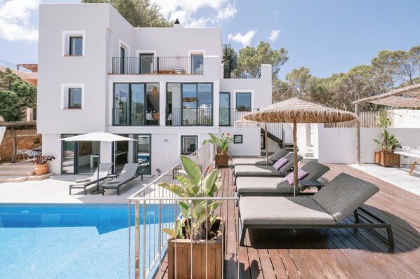 This stunning luxury 5-bedroom, 5-bathroom villa withf a heated pool offers breathtaking sea views and is just a 5-minute walk from the picturesque Cala Vadella beach.