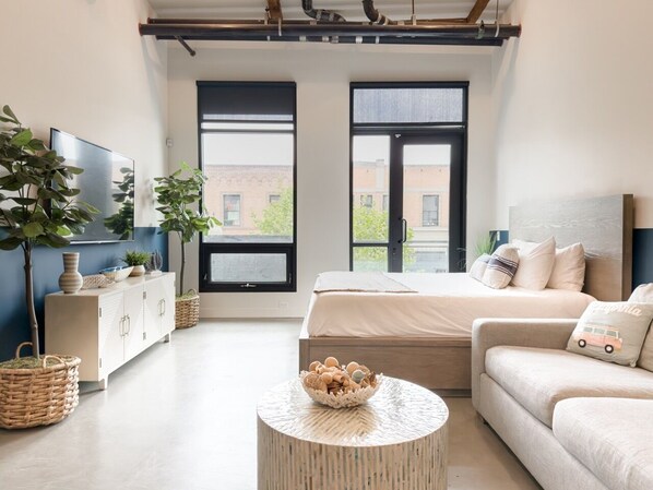 *Studio Loft *Fully equipped kitchen with pots, pans, and utensils. *Washer & Dryer in building - free to use *Pack and Play, High Chair, and Stroller provided upon request only ******************************************************* You're staying in a loft above bars and restaurants. From time to time, live bands will be playing below during the day. If you are sensitive to noise, this is not the place for you.