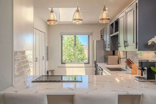 The remodeled kitchen features beautiful marble countertops and high-end appliances, including an electric cooktop that faces the living space, making it easy to socialize while cooking. Countertop seating for three overlooks the kitchen, and the four seat dining table is in-between the kitchen and living area.