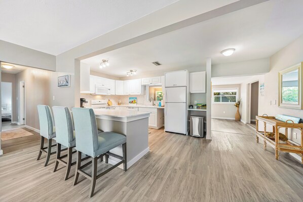 You will find the open kitchen with quartz countertops, and appliances: such as a dishwasher, microwave, blender, toaster, a Keurig, and more.