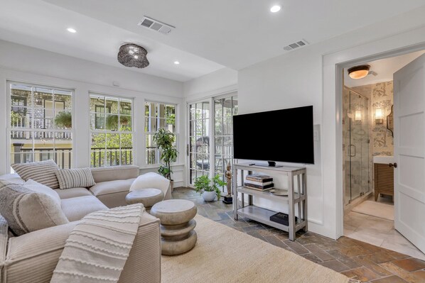 The sunroom beckons with plush seating, an ideal spot to unwind after a day of exploration. Enjoy your favorite shows on the smart television or set the mood with soft tunes as you catch up on work.