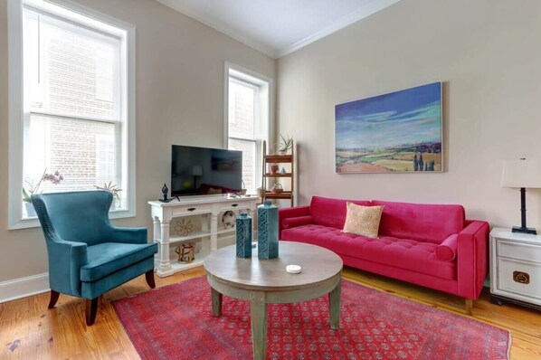 Located in the heart of Savannah’s vibrant downtown, SVR-02792 offers a comfortable stay above Flock to the Wok and Peacock Lounge. With its original hardwood floors, updated kitchen, chic furniture, and natural light-filled rooms with high ceilings and oversized windows. Relax on the oversize sofa or enjoy smart TV streaming after exploring; a coffee maker is also available for your morning brew.