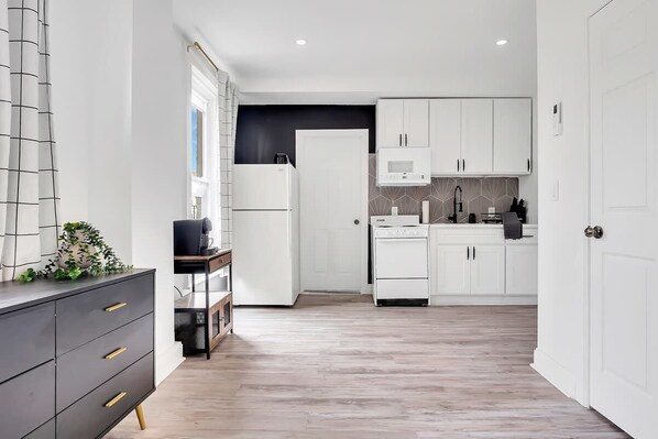 Fridge, microwave, oven, stovetop - Urban Nest #4 | Chic Studio Central to State St. (Schenectady)