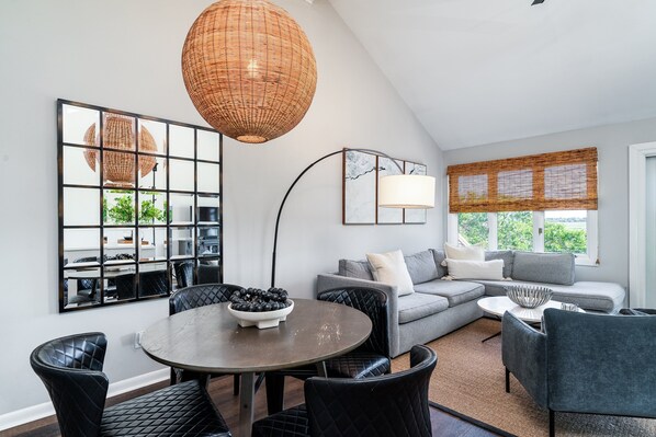 Head upstairs to be greeted by an open floor plan with vaulted ceiling. Sliding doors lead out to the upper screened porch where you will be amazed by the panoramic views. A table and chairs make it the perfect place for a little al fresco dining. The living room area has beautiful wood flooring, ceiling fan and 55" Smart TV with cable and Netflix. There is a dining area with comfortable seating for 6. A half bath is on this level and has been finished in calm, coastal tones.