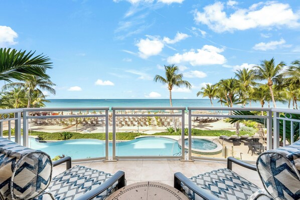 Each unit comes furnished with either a spacious oceanfront patio or balcony. Ground floor units enjoy walk-out access from the patio to the pool deck and beach--very convenient! The upper floors, however, enjoy elevated balcony views of beautiful Seven Mile Beach.