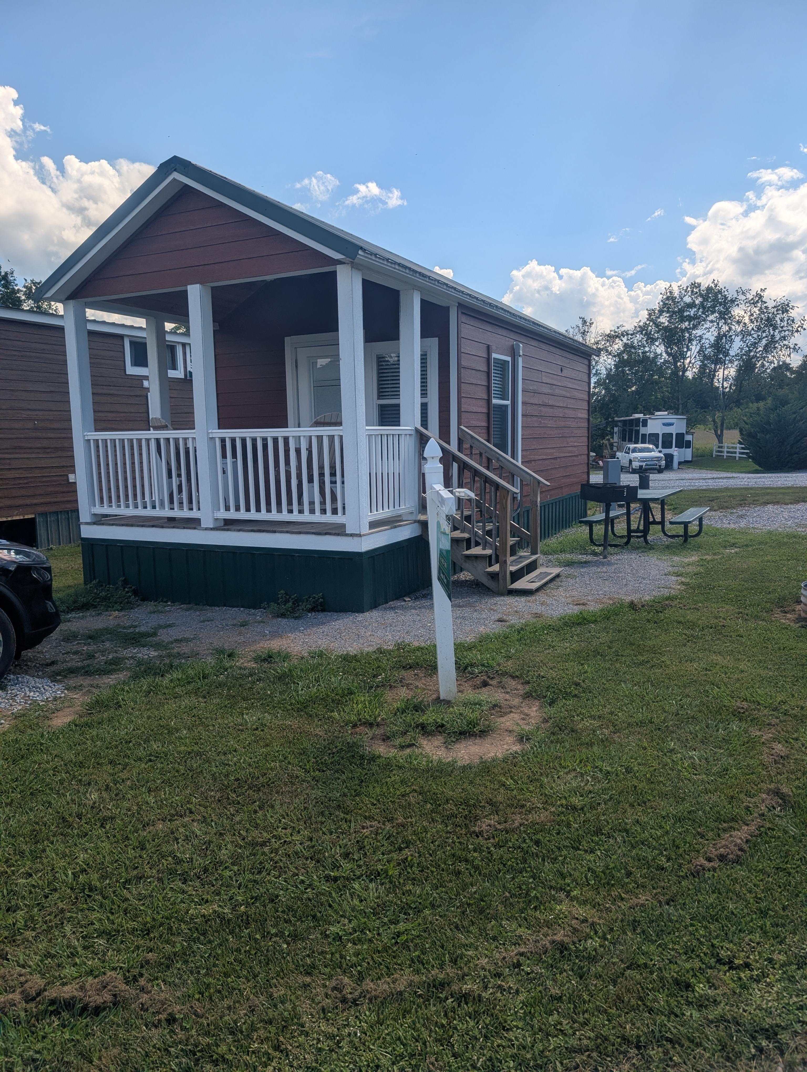 Rating Details: The property manager was very helpful. The vacation rental was very clean. I was more than happy with the location. I was satisfied with the condition of the vacation rental. Overall, I do not recommend this vacation rental. Reviewer Comments: This cabin has pros & cons, like everywhere else. My husband & I stayed here. My husband is not super tall, but he barely fit in the bed. The bed was not that comfy to cram 2 people into. The cookware was not very clean due to the people before us didn’t wash them well-no dishwasher. The rest of the cabin was very clean! Not really any storage space, it really is a tiny place (280 sq ft). The front door doesn’t seal great, so a little drafty. Coffee pot only holds 5 cups, not enough for 2 people if you are avid coffee drinkers. One big thing is no towel racks in bathroom, only a small wood “hook” that not even a hand towel would stay on, slips right off. No counter space at all in bathroom, no place to put anything while you shower.This is an RV resort. There was someone in an RV directly behind us and we couldn’t open any windows because of the smell from their septic. It depends on your needs: If you only need a place to shower & sleep, this is perfect. If you plan on spending any time in the cabin, it’s not really conducive to much. Check in and out was super easy. The company answered all my questions in a timely manner before we arrived. It has a beautiful Mountain View!! Would I recommend this? It all just depends on what you’re looking for.