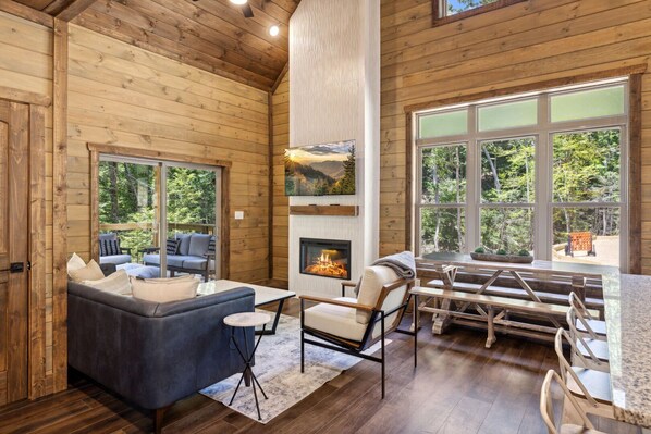 Entertainment options abound in this cabin, with amenities such as a hot tub, EV charger, horseshoe pit, shuffleboard, and three arcade games to keep everyone entertained for hours on end. And for those cozy nights under the stars, gather around the newly designed fire pit for s'mores and storytelling.