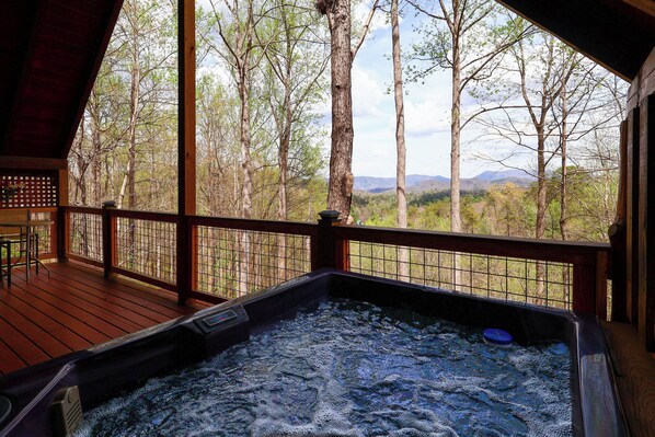 Main Level: -Only 1 step to front porch -Front porch -Fully equipped kitchen with dining table -Living area with sleeper sofa, seasonal gas fireplace, and TV -Queen bed (open to living area) -Jacuzzi tub -Bathroom with standup shower -Washer and dryer -Back deck with electric grill, outdoor seating, relaxing hot tub, and Smoky Mountain views