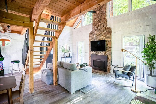 Step into the Copper Cabin! Recently renovated, this luxurious cabin is just minutes away from the Parkway and The Island. At 624 square feet, this contemporary retreat boasts an open floor plan with vaulted wood beam ceilings, a striking floor-to-ceiling built-in fireplace, and a breezy loft bedroom. Unwind in the hot tub surrounded by the gentle glow of string lights, lose yourself in the tranquil tree-lined vistas while listening to a vinyl record, or indulge in nostalgic fun with a game of Galaga or Pac-Man, transporting you back to 1981. The Cabin offers the ultimate escape!