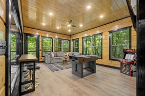 Nestled among the trees in Sevierville, Tennessee, Piper's Treehouse is a charming 3-bedroom cabin retreat. Enjoy luxury and openness on the main level with a large living room featuring ample seating and a Smart TV. Then unwind upstairs in beautifully appointed bedrooms with designer-grade amenities or explore downstairs to discover an expansive glass-walled pool room.
