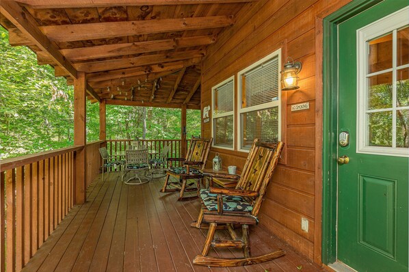 Nestled in a peaceful setting, Lazy Bear offers the perfect retreat. Unwind on the covered wraparound porch with a hot tub, connect to high-speed Wi-Fi or enjoy seasonal warmth by the fireplace. Inside, you'll find cozy living areas with Roku TVs and comfortable bedrooms.