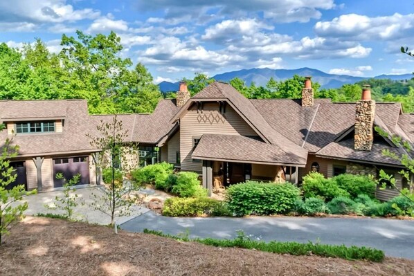 Upon entering this expansive property, guests will be greeted by the grandeur of two-story ceilings and a majestic floor-to-ceiling stone fireplace with gas logs. The great room exudes warmth, creating a spacious and inviting open-concept living space. Adjacent to the gathering area, a large dining table offers panoramic views of the Smoky Mountains, providing the perfect place to enjoy meals with those you love.