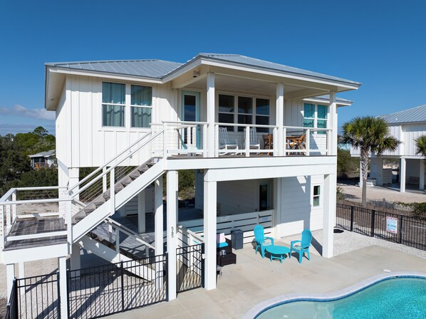 This beautiful beach vacation home in the popular Gulf Beaches neighborhood features a private sparking pool, stylish coastal decor, game room and an amazing location just steps to the beach access point, where our sugar white sand beaches await! With sleeping for 9 in 4 bedrooms, Deja Blue is also pet friendly, so your whole crew is welcome!