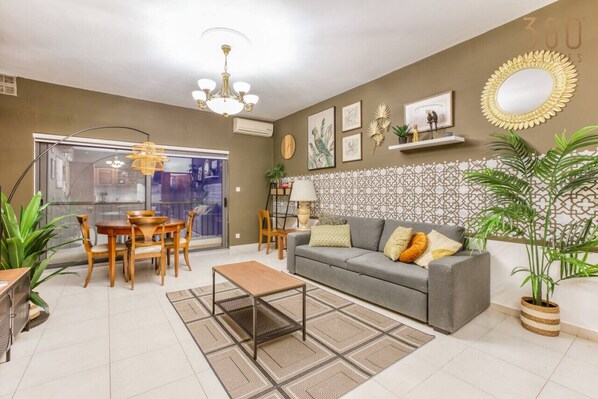 Living Spaces| A well sized sunny terrace equipped with tables and chairs where our guests can enjoy and relax their mornings with coffee and tea! Also the apartment is equipped with a dining area and a sofa overlooking the TV (Connected to the internet).