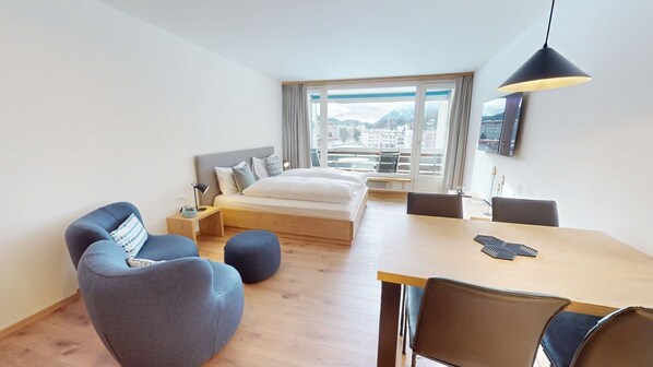Cozy, Engadine-style furnished 1-room vacation apartment on the 4th floor. Living/dining room with integrated fold-away bed. Covered balcony with view. Kitchenette, bathroom with shower. Elevator in the house, limited number of outdoor parking spaces are available (maximum 1 car per apartment, not reserved). A fitness room for public use is located in the holiday apartment building.