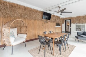 Escape to a tropical boho retreat at Casa Tuluma, where a private heated pool and spacious backyard with fire pit invite relaxation. Unwind in the open living room with comfy seating and Tulum-inspired decor, or enjoy outdoor dining on the screened-in tiki patio featuring a smart TV.