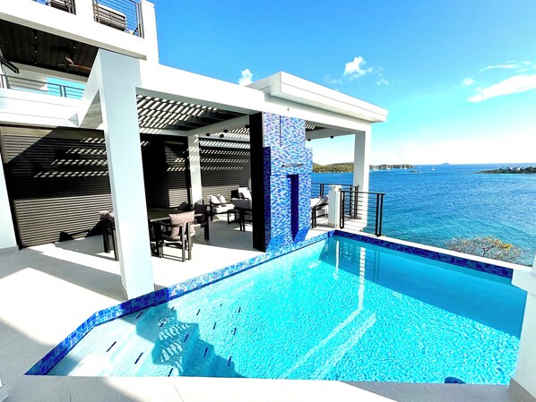 Located on Cabrita Point Peninsula, Great Bay Villa #3 West offers a serene Caribbean getaway with modern aesthetics. Enjoy expansive windows framing captivating sunrise and sunset views of the Caribbean Sea, unwind in the wrap-around pool or by the waterfall, and experience resort-like amenities including an outdoor recreational facility with pickleball and basketball courts.