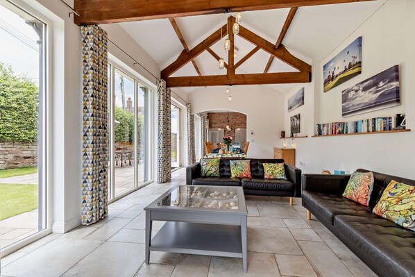 The single-level layout of the barn, with two steps down to three of the four bedrooms, fosters an open and inclusive environment, creating a sense of togetherness for the whole group. Take the ramp to the front door and step into the large entrance hall, ideal for removing muddy shoes and outdoor attire. Move then into the main open-plan living area - spacious and beautifully filled with natural light from the floor-to-ceiling glazing that run along the garden side of the property. A large island sits in the centre of the fully equipped modern kitchen. You will be charmed by the original barn features of exposed brickwork and original timber beams, tastefully blended with the contemporary décor and modern luxuries - not forgetting the underfloor heating that runs throughout the barn. A utility room and separate WC sits just off the kitchen, along with a level-access double bedroom and its ensuite shower room. When it's time for the group to settle in for the evening, enjoy the luxurious atmosphere of a traditional log burner whilst indulging in the favourite family board game or complimentary Netflix on the spacious sofas. Heading back through the entrance hall and down the steps, you will find the family bathroom servicing two super-king bedrooms - available as twins on request. The final bedroom is the master suite complete with a super-king bed, ensuite shower room and patio doors that exit onto the enclosed garden. To ensure your canine members of the family enjoy their getaway too, a dog washing station, treats, dog specific towels, beds, water and feeding bowls are provided for their use and enjoyment.