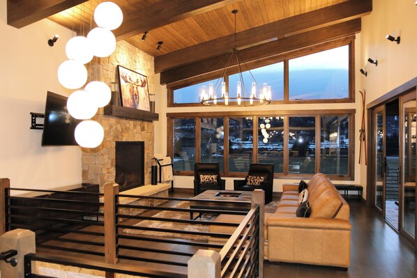 Designed for Connection, Built for Comfort From the moment you enter, you’re welcomed by soaring vaulted ceilings, exposed beams, and expansive windows that frame sweeping views of Emerald Mountain and the surrounding landscape. The main living area is warm yet refined, anchored by a stunning stone fireplace and layered with textures that create a true mountain-modern feel.