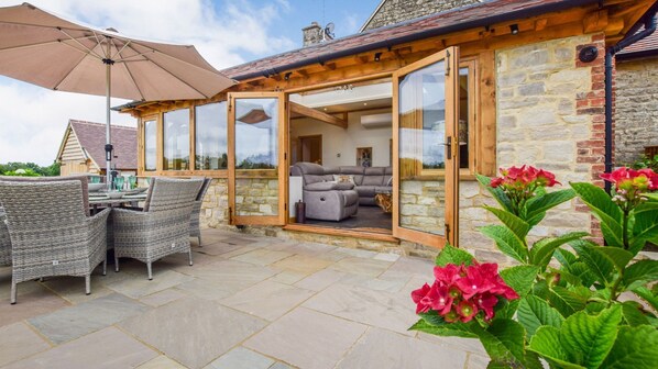 To ensure guests are comfortable at all times, even on the hottest days, the dining-living area has air conditioning, the cooling effect of which extends through the whole of the downstairs if needed. There are also plenty of windows that can be opened, plus French doors to the patio, and a lantern ceiling window that can be opened.
