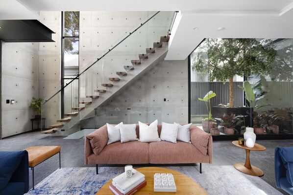 - Sunlit living room, polished concrete floors