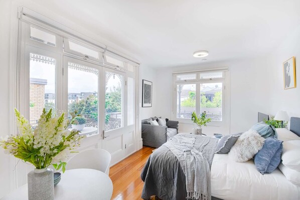 How many studio apartments do you see that have not one, but two Victorian-style wrought iron balconies? How many do you see that have all new furniture and appliances? How many do you see that are light, airy and have views of the surrounding area? This place has all that and more, including a location minutes from transport to the city and a short-walk to the harbour. You can't miss the the foodie paradise of the Tramsheds dining precinct either: it's just across the road.
