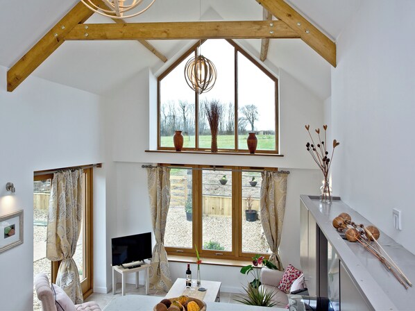 Wet Room: Shower, Heated Towel Rail, Toilet. LPG underfloor central heating, gas, electricity, bed linen, towels and Wi-Fi included. Welcome pack. Enclosed gravelled patio with garden furniture and firepit. Private parking for 2 cars. Wheelchair access. No smoking.. Bronze winner of Bristol Bath and Somerset Tourism Awards 2022-2023. Enjoy a romantic break away with your partner at The Stables, which nestles on Cleve Farm in 24 acres of glorious pasture and woodland, close to the Somerset/Devon border. The first thing you will notice when you arrive here are the beautiful floor-to-ceiling windows in the living area, so you can relax with a coffee in the morning whilst taking in the views over the fields. The combination of old and new styles with the comfort of modern facilities has given The Stables its charm and uniqueness.