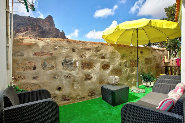 The holiday home Casa del Callejón is located near Tejeda (10-15 minutes walk) and impresses guests with its view of the mountain. This is a cave house with stable and comfortable temperatures. The 80 m² holiday home consists of a living room, a very well-equipped kitchen, 3 bedrooms and 1 bathroom as well as an additional toilet and can therefore accommodate 4 people. Additional amenities include a TV and a portable cooker.